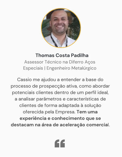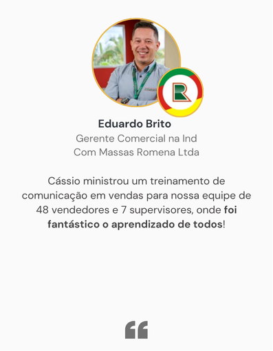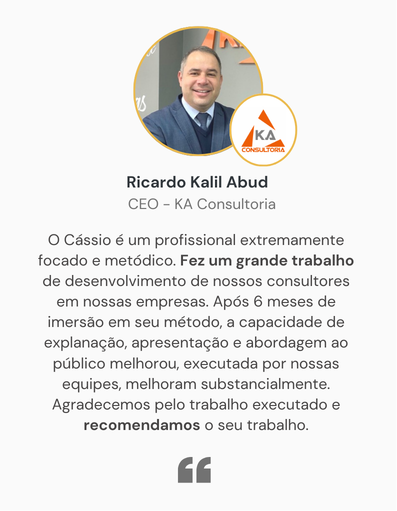 Vasta Experiência em Treinamento: Cássio atuou como professor por mais de 20 anos, desenvolvendo alunos dos 14 aos 70 anos. Ele também trabalhou como consultor comercial e hoje treina times de vendas em diversos segmentos, desde serviços e imobiliário até indústria e varejo.