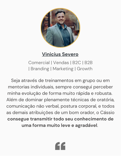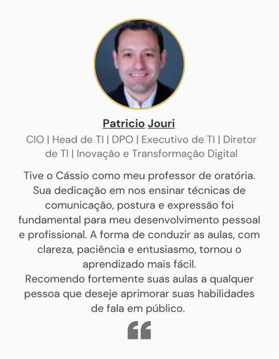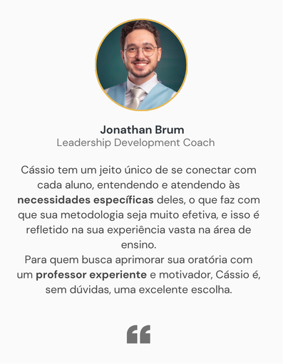 Formação Holística e Personalizada: Cássio é Psicopedagogo Clínico, especialista em Neuropsicologia e Pedagogia Empresarial, e atualmente está cursando Mestrado em Recursos Humanos. Essa formação diversificada permite que ele crie estratégias de aprendizagem personalizadas para superar o medo de falar em público e aprimorar habilidades de comunicação em ambientes corporativos.